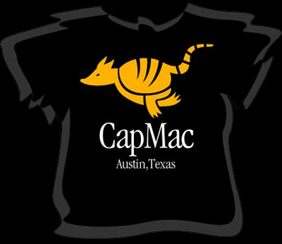 I was heavily involved in CapMac while living back in Austin and one of the guys tracked me down in Skidville looking for another T-Shirt design (my third for the group). Apple had just announced their new System X, codenamed Panther, and they were looking for an updated version of my old "mugadillo" logo for the new shirt. The original logo was an armadillo curled up in the shape of the Apple logo. After googling a few panther images off the web, I came up with the "jagadillo" graphic above. The T-Shirts were printed and as near as I can tell, were a big hit with the group. CapMac president Glenn Chase writes "Your t-shirt design received universal acclaim and we sold 27 of them at our Spring Cleaning Sale on Saturday!"